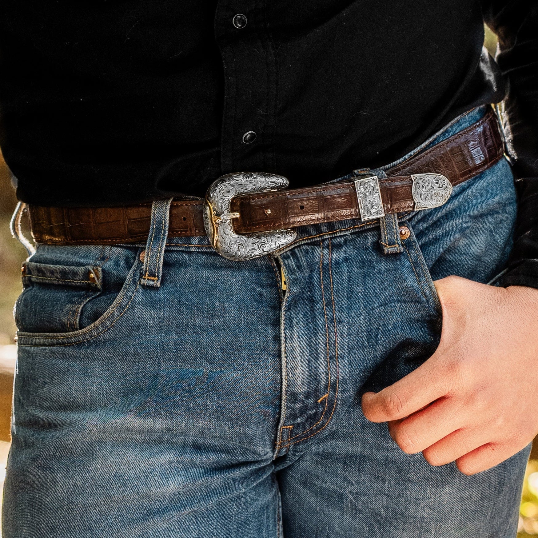 The set includes a Buckle, Loop, and Tip, all meticulously hand-engraved on both the front and back. This attention to detail ensures a unique, enduring look that never goes out of style.