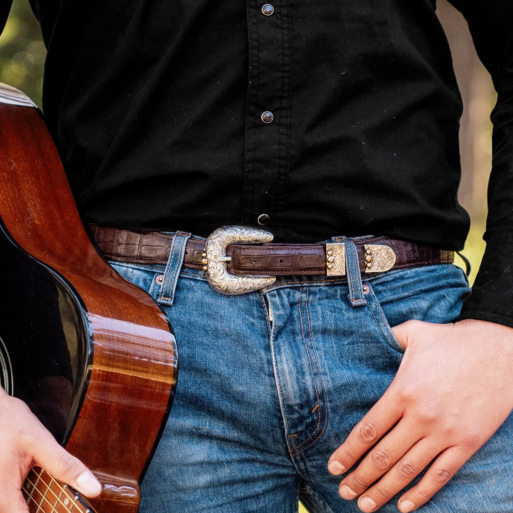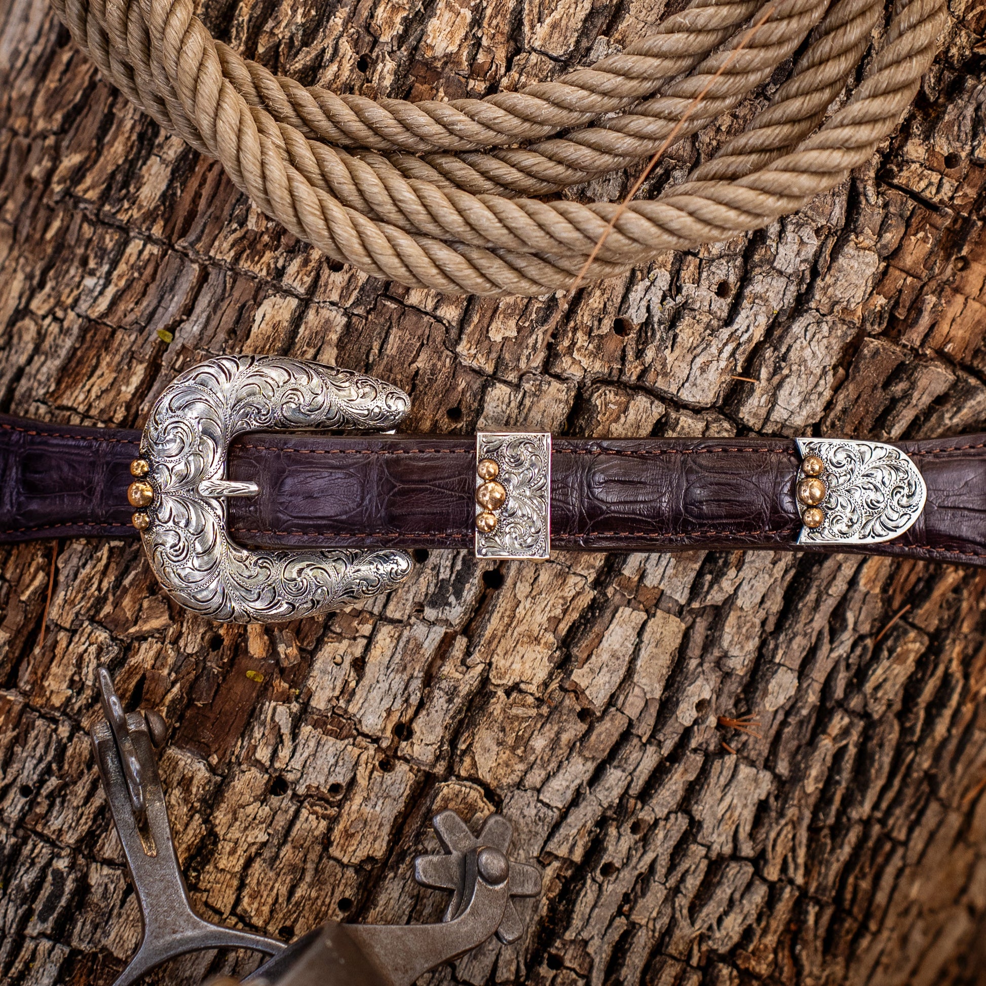 The Whiskey King – a timeless Western design that elevates any outfit, whether paired with faded blue jeans or your finest evening wear. This distinguished buckle set is crafted to make a lasting impression with its perfect blend of rugged style and refined elegance.
